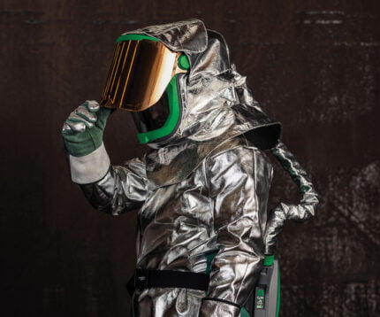 The RPB Radiant Heat kit transforms your Z-Link respirator into a complete protective system for high heat environments. Utilizing the Z-Link headtop, experience unrivaled comfort as heat is deflected away from you and air continuously circulates throughout the headtop so you can work safer for longer.The Radiant Heat kit features a large, gold coated visor that reflects heat off you, keeping your body temperature down, while allowing you to see all of your environment with an uncompromised field of view. With flame resistant and reflective materials this protects you from sparks and splashes while providing additional relief from the heat.