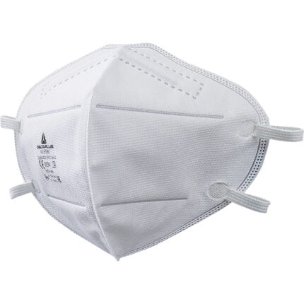 Box of 20 non woven synthetic fibre disposable masks FFP1. Moulded mask. Nose clip for adjustment. Foam edge under nose clip. DOLOMIA optional test for longer continuous wear time.