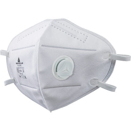 Box of 10 non woven synthetic fibre disposable masks FFP1. Nose clip for adjustment. High performance exhalation valve. Hygienic individual plastic bag. DOLOMIA optional test for longer continuous wear time.
