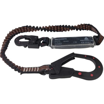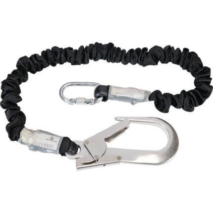Fall arrester with energy absorber in woven webbing with integrated crumple on the lanyard. Retracted length: 1.40 m. Stretched length: 2 m. 1 Screw lock carabiner in galvanized steel, opening 17 mm (AM002). 1 Automatic hook lock in galvanized steel, large opening 55 mm (AM022).